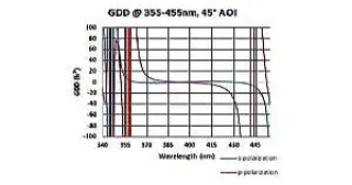 上記のグラフは、溶融シリカのウルトラファーストミラーのものです。図に示すように、ミラーの GDD は 370nm から 420nm の間で 30fs2 未満 (s 偏光と p 偏光の場合) です。この特性により、このようなミラーは分光、材料処理、医療業界などの分野で非常に役立ちます。