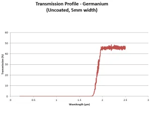 透過プロファイルからわかるように、ゲルマニウムは 2μm を超える波長のロングパス フィルターとして機能します。屈折率が高い (2μm から 14μm で 4.0) ため、色収差が最小限に抑えられ、反射防止コーティングが施されています。さらに、傷がつきにくく、空気、水、アルカリ、さまざまな酸に対して不活性です。密度が比較的高い (5.323 g/cm3) ため、重量が制限される用途では考慮する必要があります。