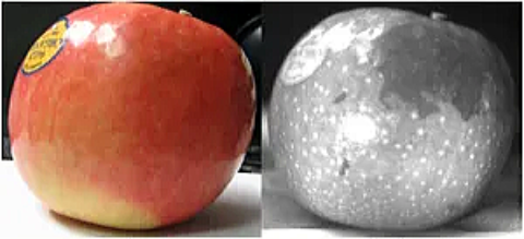 カメラは、水分で飽和した領域を強調表示することで、農産物内の水分を検出します。水分含有量が多い領域は、乾燥した部分と比較して暗く表示されます。これらの画像には、リンゴの皮の表面下の傷が示されています。これは肉眼では検出できませんが、SWIR