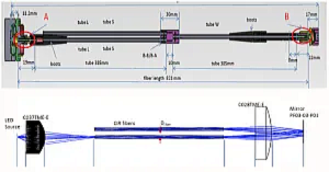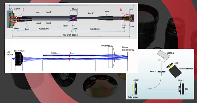 反射ファイバー プローブはカルコゲニド ガラスで作られています。その設計における主な課題は、図 2 に示すように、照明ビームと収集ビームの効率的な結合です。