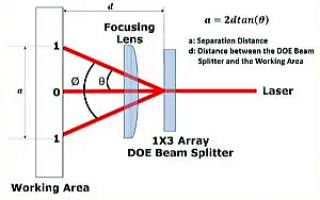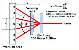DOE ビーム スプリッターは、平行入射ビームを複数のビームに分割するために使用されます。出力は、結果として得られるビーム間で共有されます。これらのビームは、セットアップに応じて 1xN アレイ (1 次元) または MxN アレイ (2 次元) を形成します。結果として得られるビームは、分離角度 θ でビーム スプリッターから出ます (図 1)。ビーム数が奇数 (N) の場合、0 次に位置する目的のビームがあります。ビーム数が偶数の場合、0 次に位置するビームはありません。目的の作動距離で明確なスポットを実現するために、図 1 および 2 に示すように、集束レンズがよく使用されます。