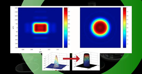 DOE ビーム シェイパーのセットアップは、通常、レーザ、DOE ビーム シェイパー、スキャン システム/レンズ、および作業面で構成されます (図 3)。ビーム シェイパー DOE は、ガウス ビーム スポットのエネルギーを均一な強度のトップ ハット プロファイルに分散します。これにより、作業面へのレーザ照射が均一になります。トップ ハット プロファイルは、処理済み領域と未処理領域の間に明確な境界を生成する鋭い遷移領域によって識別されます。出力プロファイルは、長方形または円形のいずれかになります (図 4)。