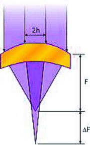 レーザビームの直径「2h」の内側部分は、レンズのセクションによって遮られます。そのセクションはレンズの 外側部分より長い焦点距離(FL)を持っています。