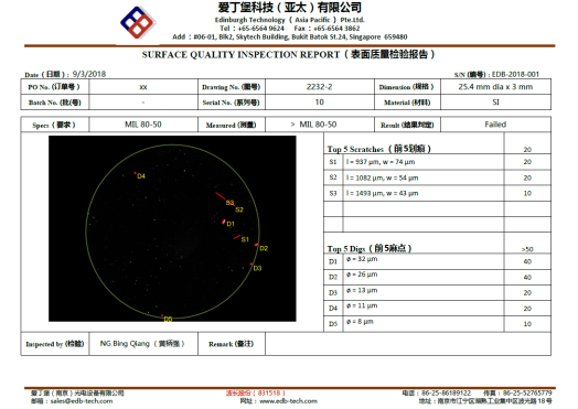 | スクラッチ / ディグ | 10-5、20-10、40-20、60-40、80-50 *3ピクセル未満の欠陥は含まれません(解像度はアップグレード可能) |