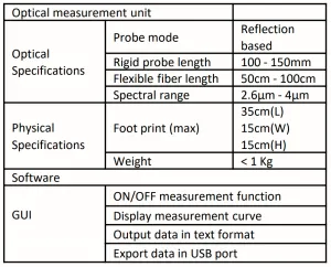 分光計の原理は、図 1 に示すように、反射ベースの赤外線分光法に基づいています。中赤外線分光計は、a) 光源と検出器ユニット、b) 柔軟なセンサー ヘッド、および c) 取得したデータを操作、制御、および処理するためのグラフィカル ユーザー インターフェイス (GUI) で構成されています。