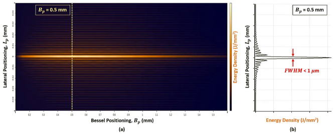 アキシコンレンズを通したベッセルビームの生成により、回折特性のない横方向の光エネルギー分布が生成されます。 ビームが収束する位置では、より長い回折のない領域が生成され (図 2)、ビームのエネルギー密度は伝播距離によって変化しません。 アキシコンレンズと集束レンズを組み合わせると(図3)、高エネルギーのベッセルビームが得られます(図4)。