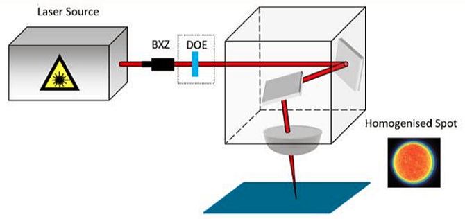 ビーム整形器を含む一般的なセットアップは、図 1 に示すように、レーザ、ズーム ビーム エキスパンダー (BXZ)、ビーム整形器要素、走査システム、および処理対象の表面で構成されます。