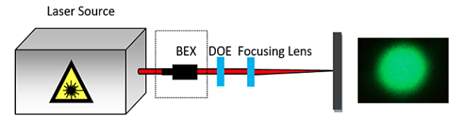 ビームディフューザーに基づく一般的なセットアップは、図2に示すように、レーザ、ズームビームエキスパンダー、ビームディフューザー素子、集光システム、および処理対象の表面で構成されます。