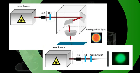ビームシェイパーとビームシェイピングディフューザーは、入射レーザビームを正方形、円形、または線状の小さく均質なトップハットスポットに整形するために一般的に使用される