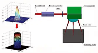 DOE ビーム シェイパーのセットアップは、通常、レーザ、DOE ビーム シェイパー、スキャン システム/レンズ、および作業面で構成されます (図 3)。ビーム シェイパー DOE は、ガウス ビーム スポットのエネルギーを均一な強度のトップ ハット プロファイルに分散します。これにより、作業面へのレーザ照射が均一になります。トップ ハット プロファイルは、処理済み領域と未処理領域の間に明確な境界を生成する鋭い遷移領域によって識別されます。出力プロファイルは、長方形または円形のいずれかになります (図 4)。