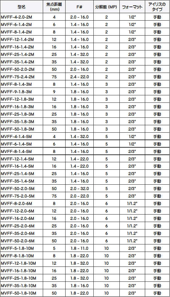 ・波長: 400 - 700 nm ・解像度: 1 ? 5 MP ・フォーマット: 1/2 インチおよび 2/3 インチ ・接続: Cマウント ・アイリスタイプ: マニュアル ・コーティング: 400 ? 950 nm ・焦点距離: 無限 ? 0.1 m
