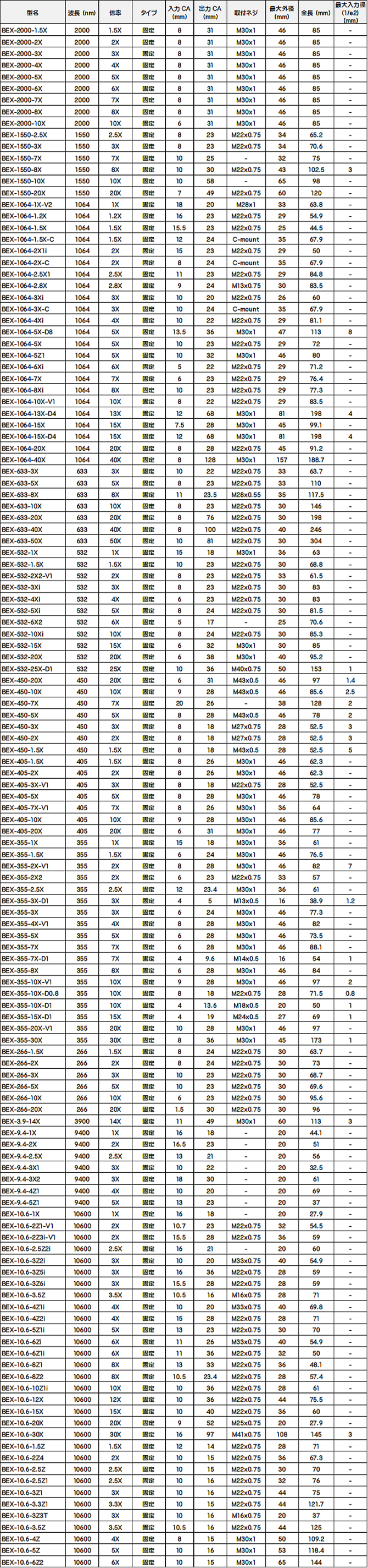 ▼ビームエクスパンダー製品リスト一覧 ▼ビームエクスパンダーの光学アライメント方法