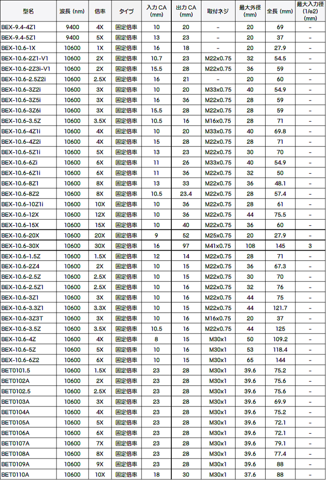 ▼ビームエクスパンダー製品リスト一覧 ▼ビームエクスパンダーの光学アライメント方法
