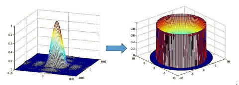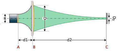 左側の「A」からのガウスビームが出射され、ある程度の距離を通過し、DOE素子に入射した後、次いで、M型光強度分布を実現するために、離れた"C"の焦点面から薄肉レンズを通過します。