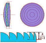 回折レンズは、従来のレンズシステムの素子数を削減したり、色収差を補正するための特殊な材質を取り除くのに 使われます。回折レンズは、全体的な高さ深度がλ/(n - 1)となる非常に薄い素子です。ここで、λは動作波長、 nは屈折率です。回折レンズは、レンズ端の方へより精密になる一連のゾーンからできています。