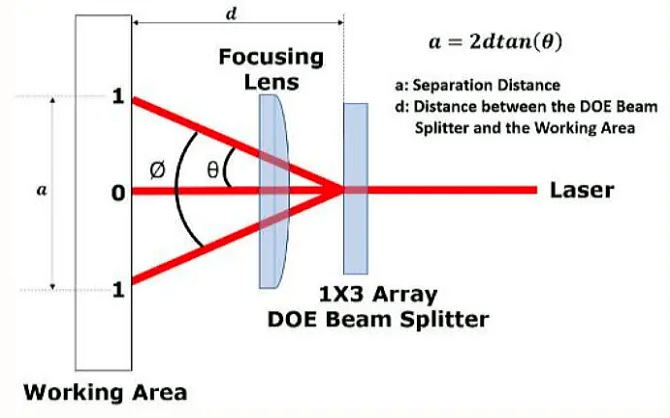 コリメートされたレーザ光は、ビーム スプリッター DOE のアレイ (1 x N または M x N) に入射し、入力ビームを N 個のビームに分割します。 N 個の出力ビームはビーム スプリッター DOE と何らかの分離角を形成し、奇数のビーム (N) に対して必要な 0 次ビームが存在します。 集光レンズは、多くの場合、所望の作動距離で出力を達成するために使用されます。