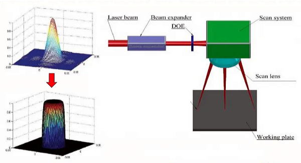 このセットアップは、レーザ光源、ビームシェイパー DOE、スキャンシステム/レンズ、および作業面で構成されます。 ビーム シェイパー DOE を通過した光は、ガウス ビーム エネルギーを円形または長方形のトップハット プロファイルの均一な強度に分散します。