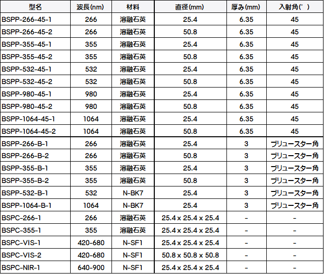 ・波長: 380-2100 nm (N-BK7) | 195-2100 nm (溶融石英) | 420〜680 nm(N-SF1)