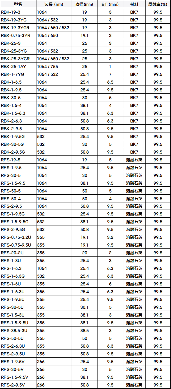 ・損傷しきい値 @ 20ns、20Hz: 1064 nm の場合 20 J/cm2 / 53 2nm の場合 15 J/cm2 / 355 nm の場合 10 J/cm2