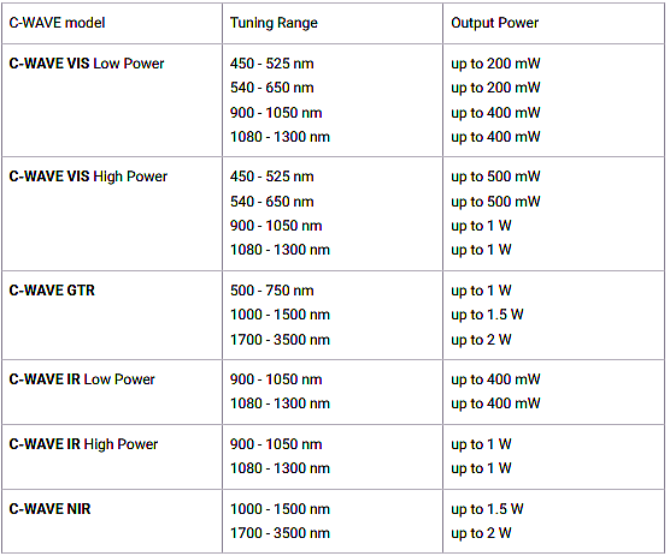 C-WAVE チューナブル レーザーは、光パラメトリック発振器 (OPO) テクノロジーに基づいた、広範囲にチューナブルな連続波 (CW) の単一周波数レーザー光源です。 可視および近赤外線の波長範囲全体にわたって、コンピューター制御によるトータルな発光調整を実現します。